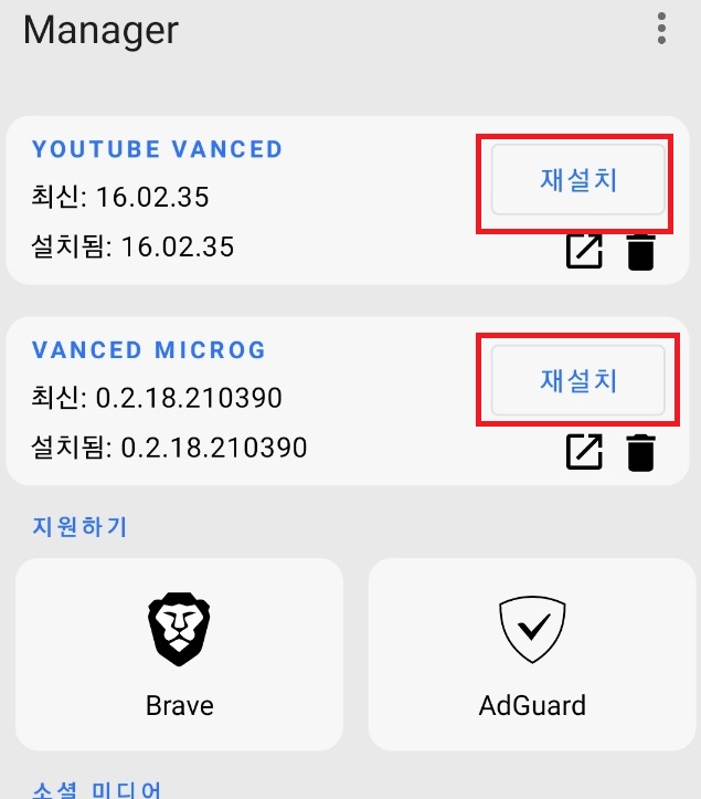 유튜브 밴스드 매니저를 실행을 해주시면, 사진과 같이 나오는데 저는 이미 설치가 되있어서 재설치라고 나와있습니다.