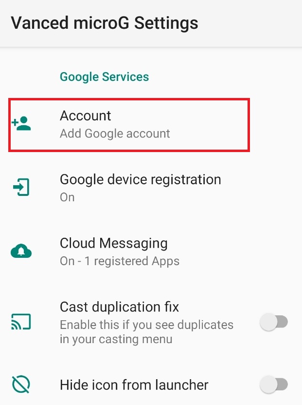 Vanced MicroG를 실행 하면 해당 화면이 뜹니다. 거기에서 맨위에 Account를 눌러 자신의 유튜브 로그인 구글 계정을 추가해 주셔야 합니다.